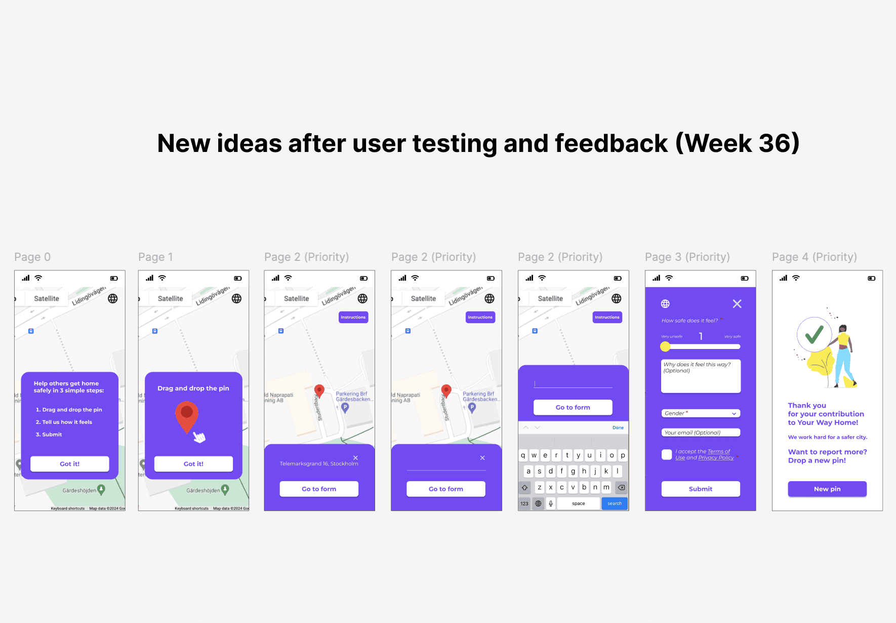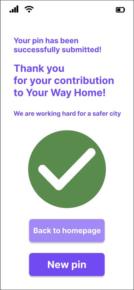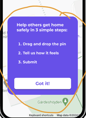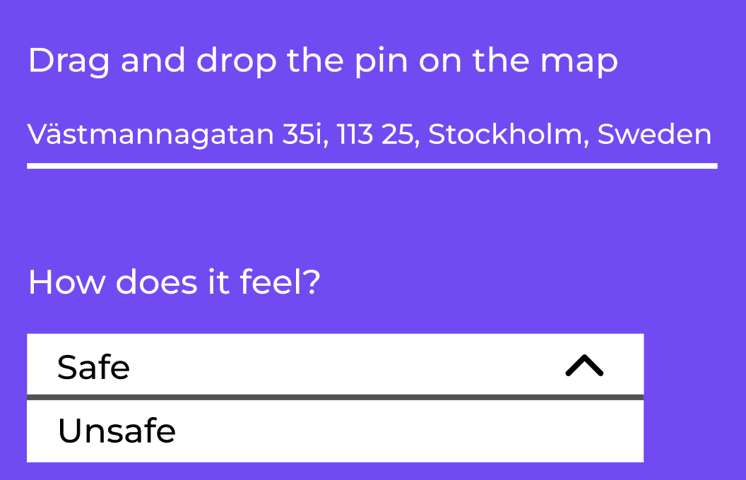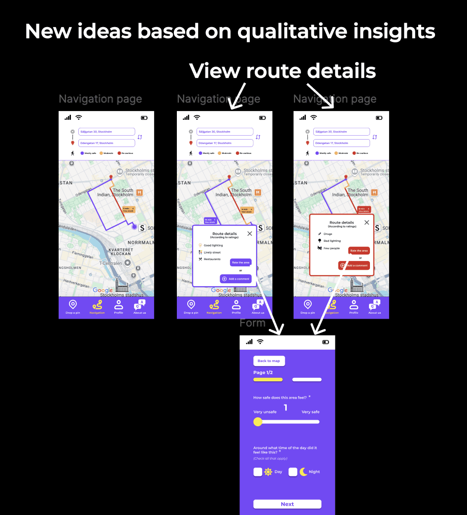 As mentioned before, the goal of the project was to gather crowdsourced data about street/area safety perception in order to develop an algorithm that recommends the safest route to the users. Our design decisions were based on feedback we got from user research and the first usability testing. The goal of the design decisions was to create a "Drop-a-pin" process that showed clearly the purpose of the platform being, at the same time, trustworthy, fun and inspiring.