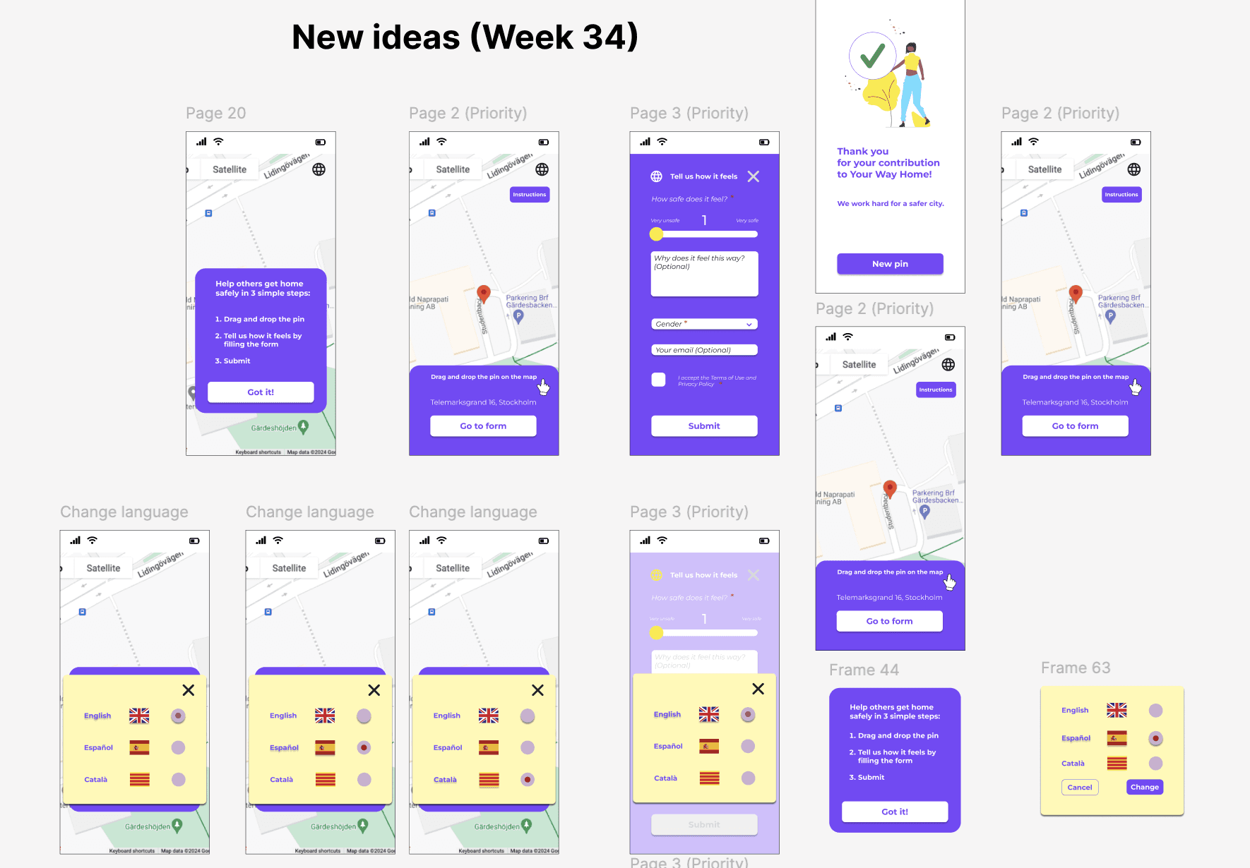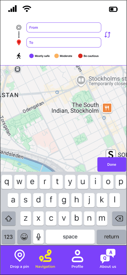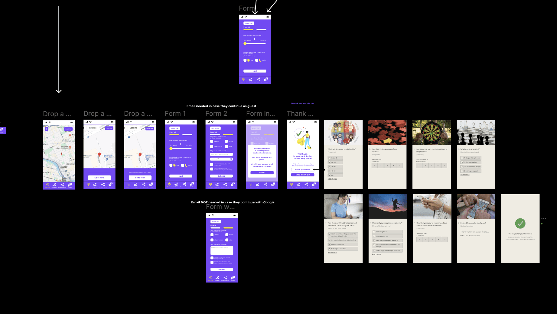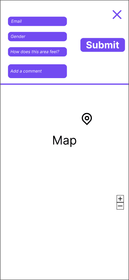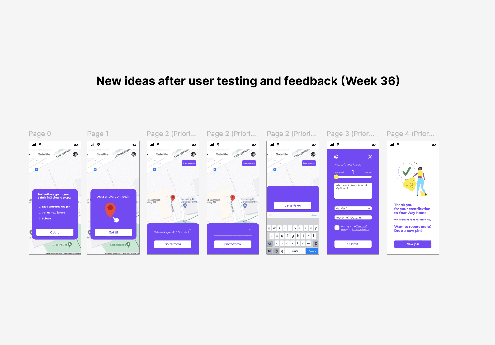 As mentioned before, the goal of the project was to gather crowdsourced data about street/area safety perception in order to develop an algorithm that recommends the safest route to the users. Our design decisions were based on feedback we got from user research and the first usability testing. The goal of the design decisions was to create a "Drop-a-pin" process that showed clearly the purpose of the platform being, at the same time, trustworthy, fun and inspiring.