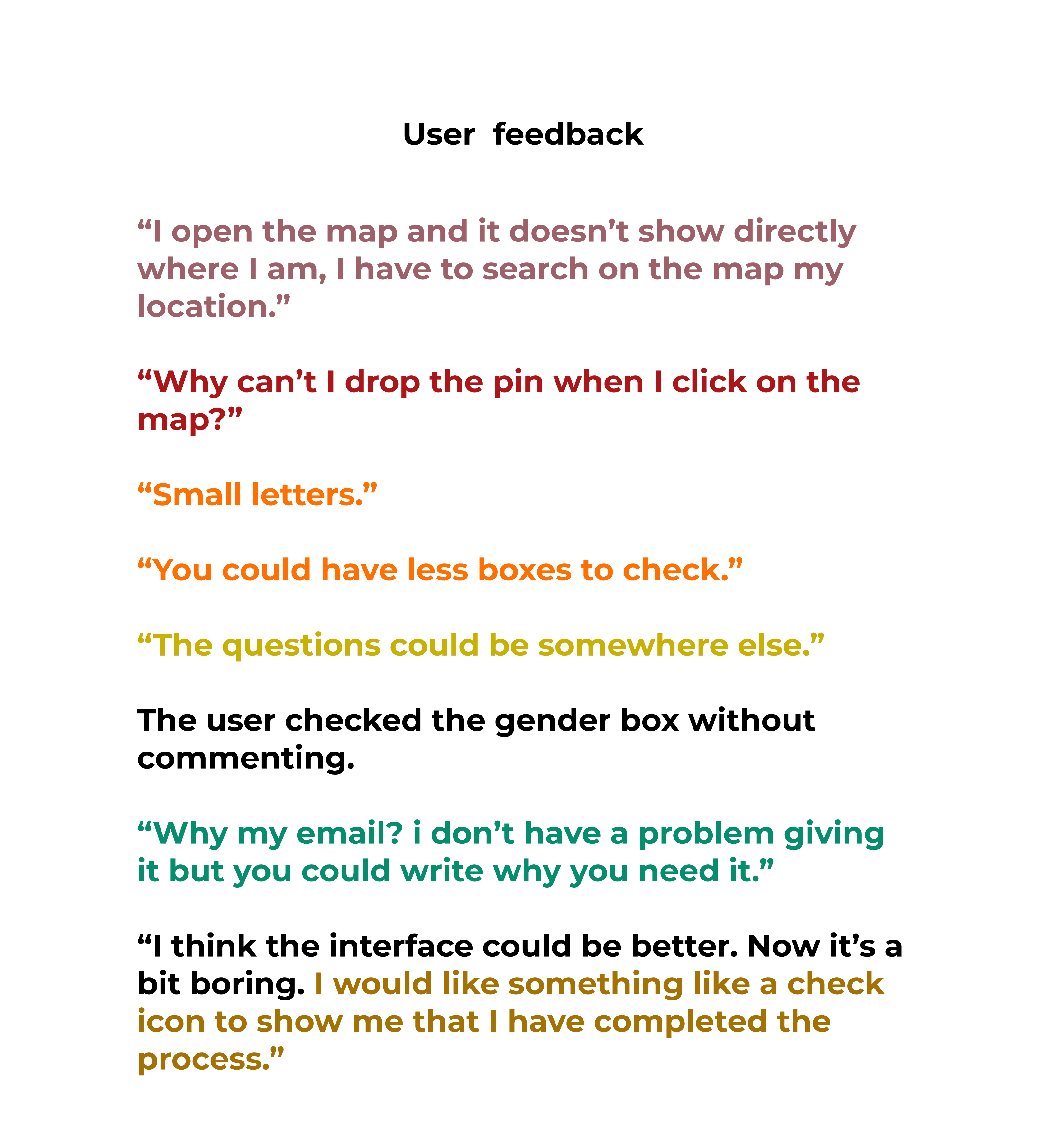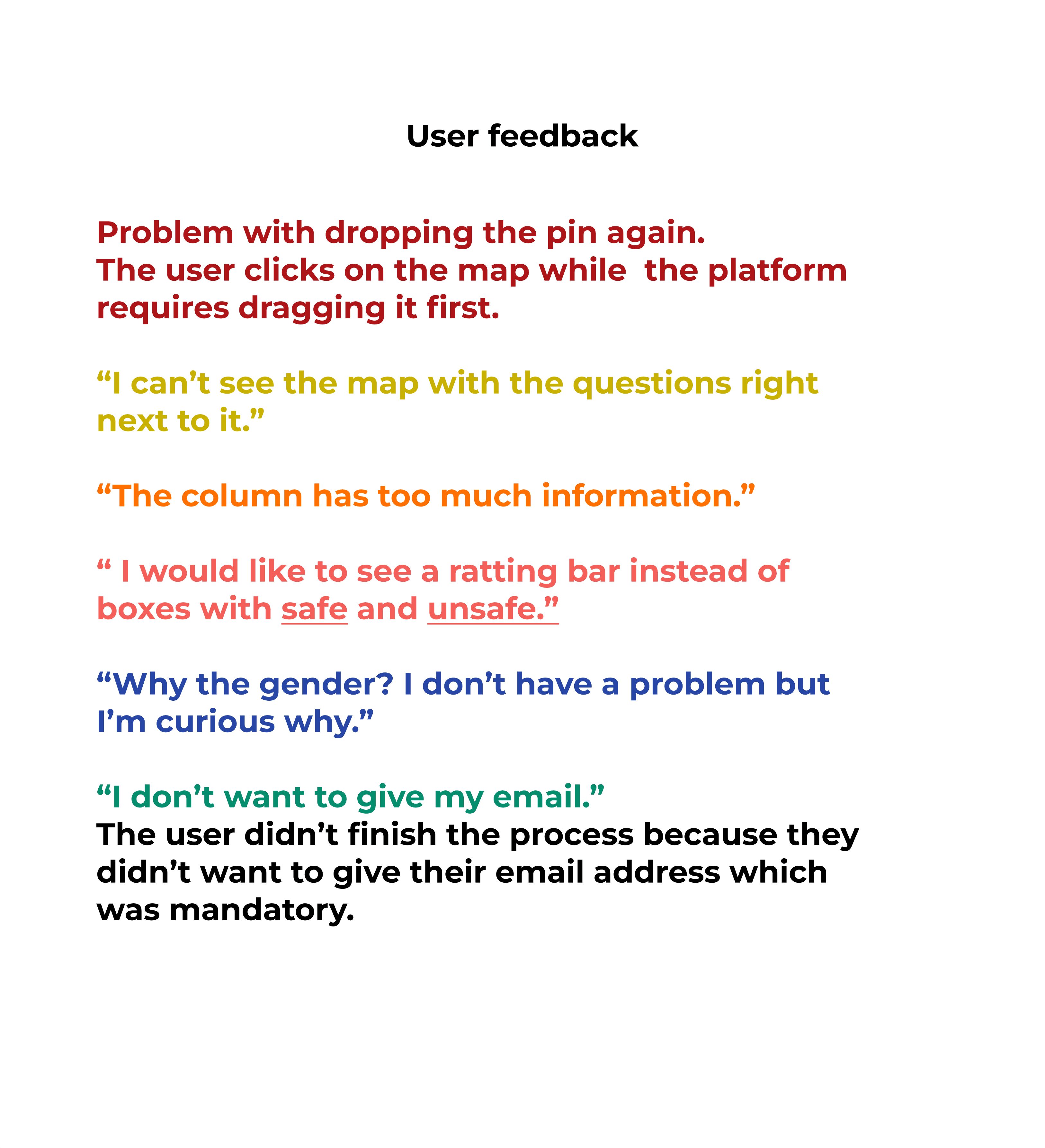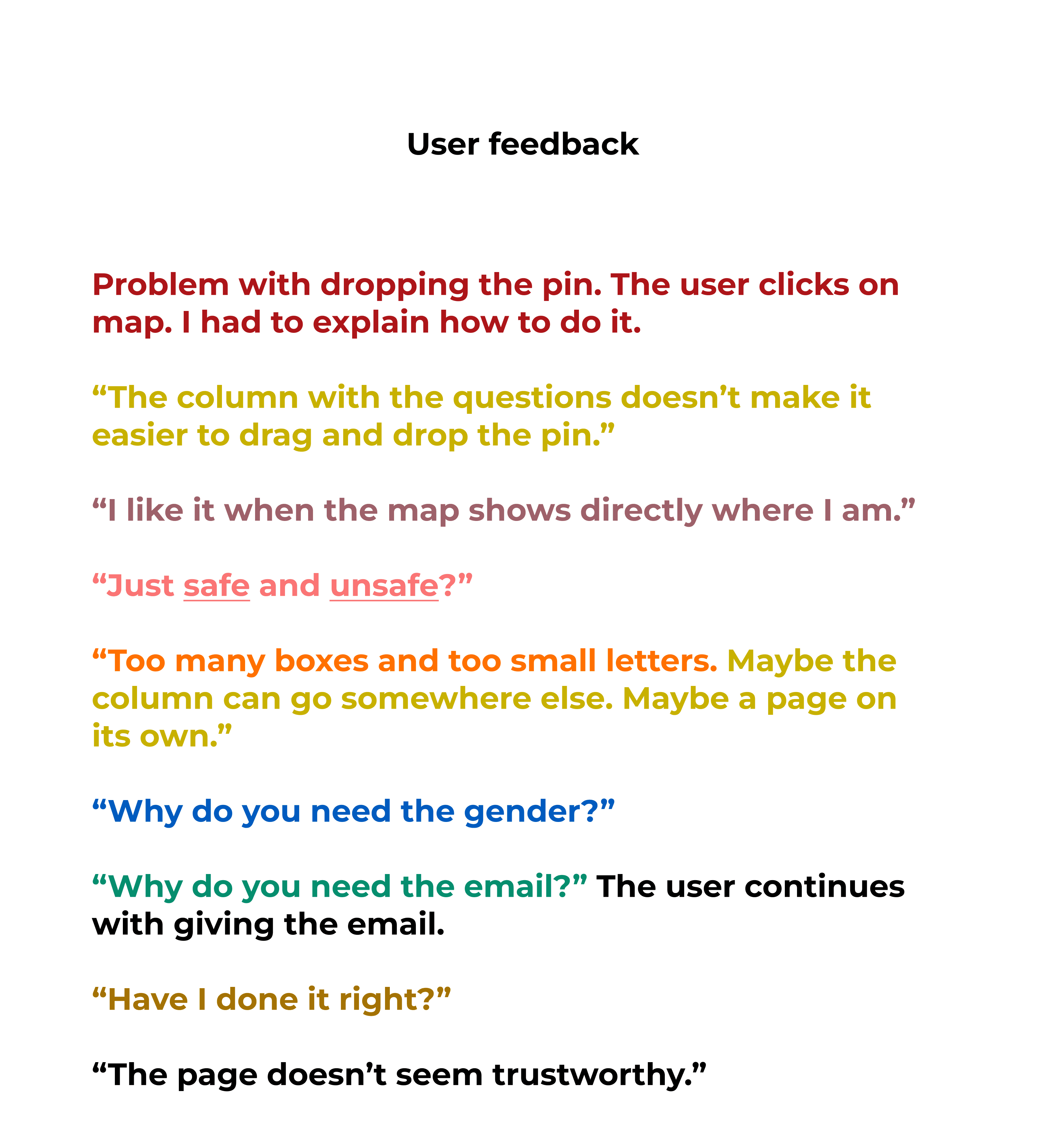 First round of usability testing: In parallel with the interviews, I tested the original interface and collected feedback. I used the Think Aloud method and all tests were conducted on each user's mobile phone to have a picture as realistic as possible. The scenario: "Find a place on the map that you have certain feelings about its safety, rate it and answer the questions". I gathered the feedback and examined the recurring themes. I gave each recurring theme its own colour code so I could quickly identify the patterns that came up again and again.