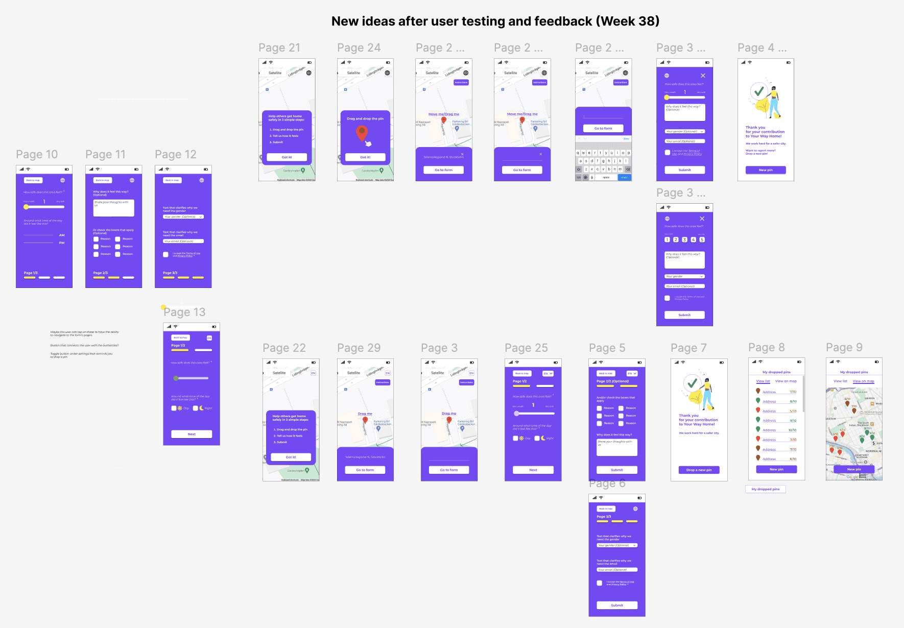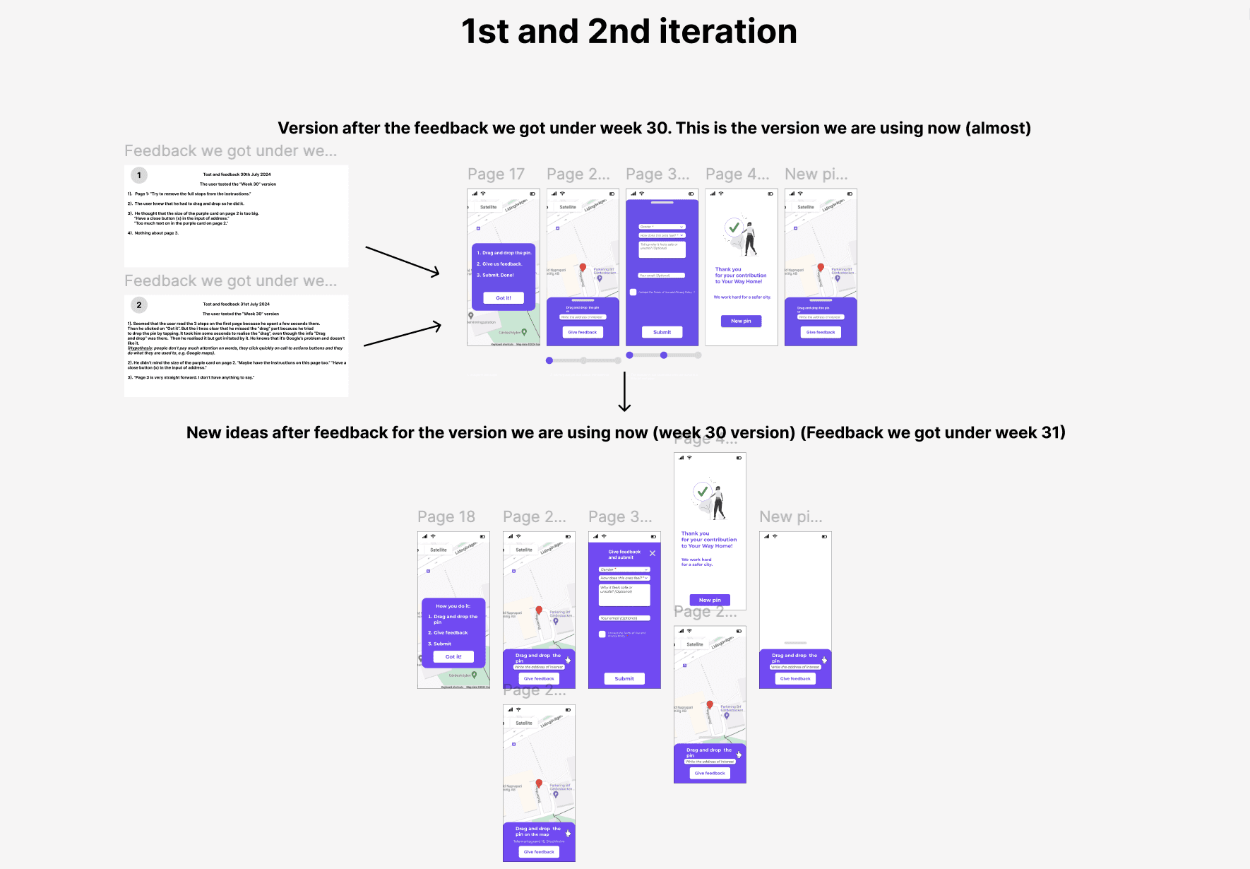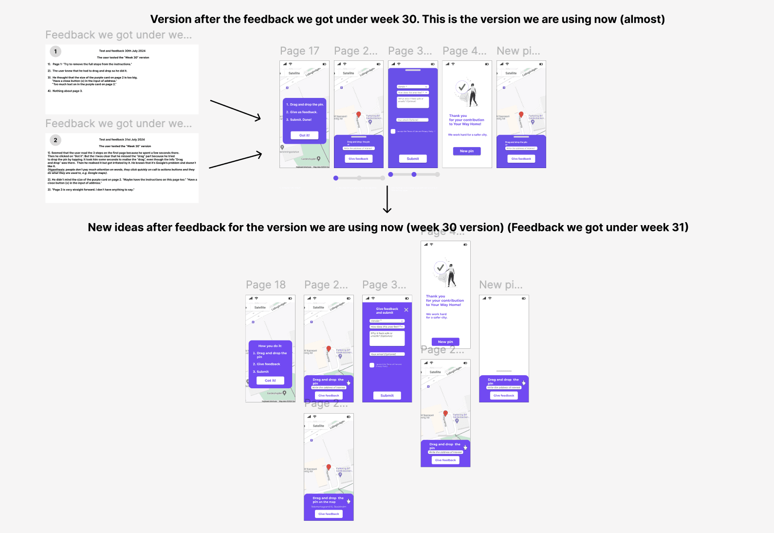 First round of usability testing: In parallel with the interviews, I tested the original interface and collected feedback. I used the Think Aloud method and all tests were conducted on each user's mobile phone to have a picture as realistic as possible. The scenario: "Find a place on the map that you have certain feelings about its safety, rate it and answer the questions". I gathered the feedback in Figma and Miro so the whole team would have access to it and I examined the recurring themes. I gave each recurring theme its own colour code so I could quickly identify the patterns that came up again and again.
