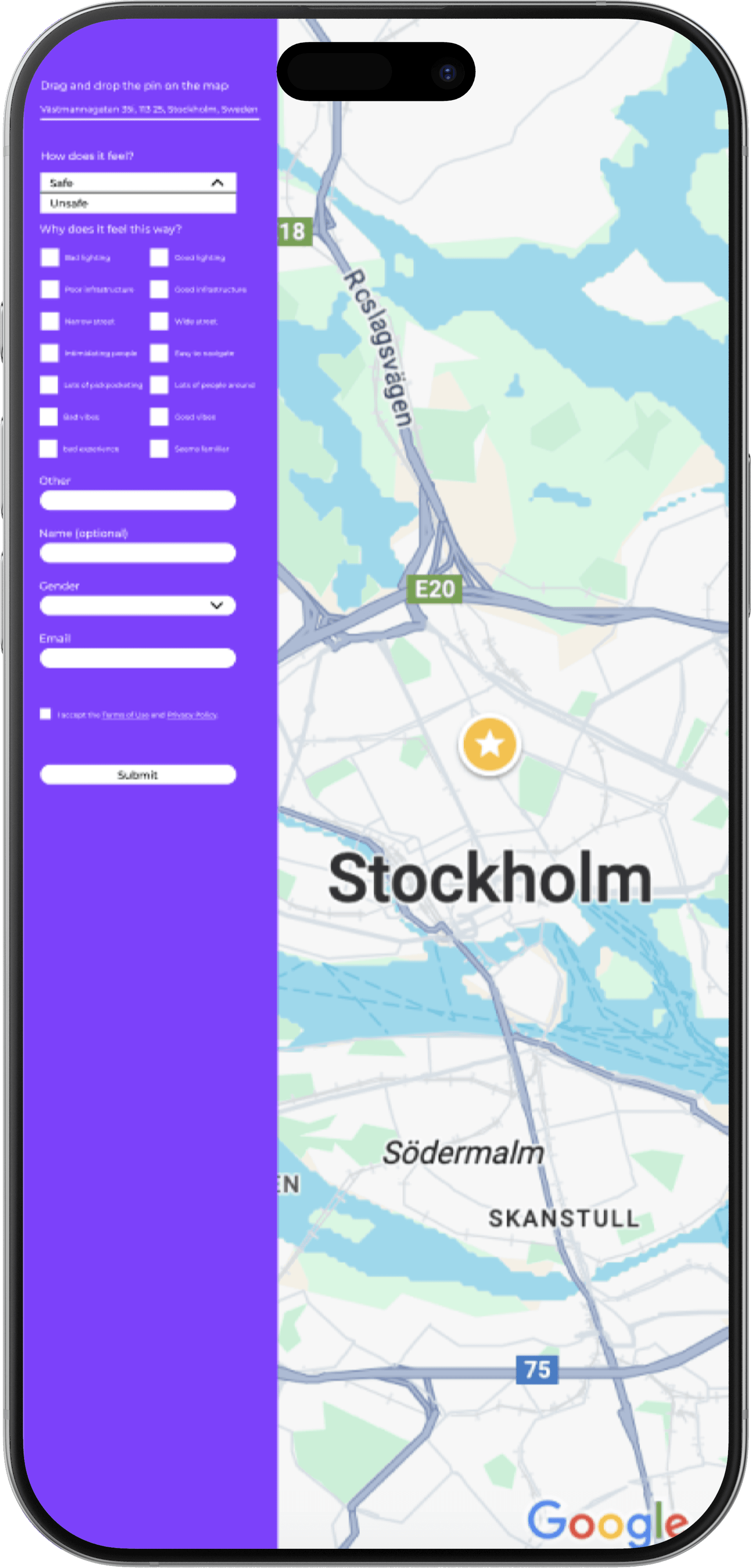 The data was collected through the "Drop-a-pin" feature, a platform where users rated places and answered some questions about safety to help us gather valuable information.