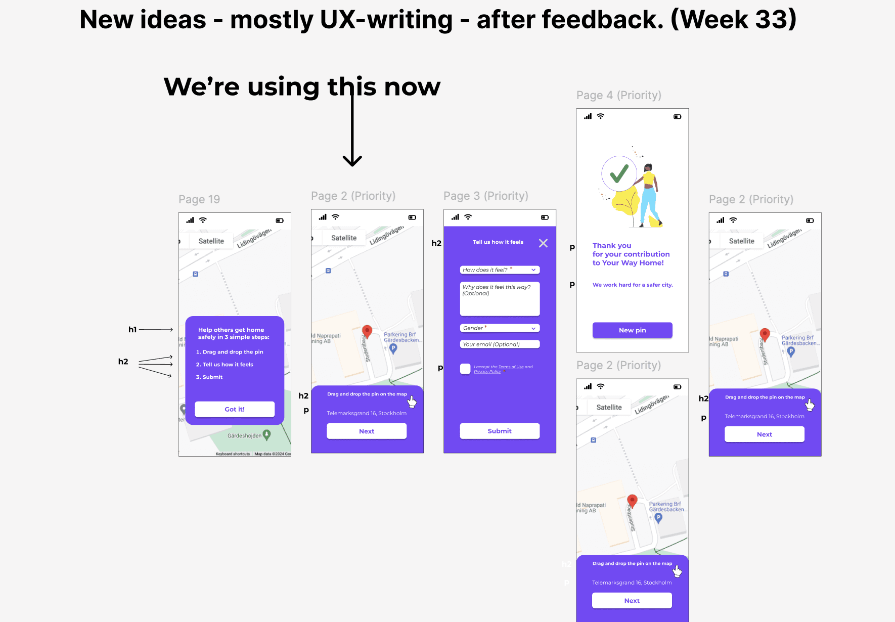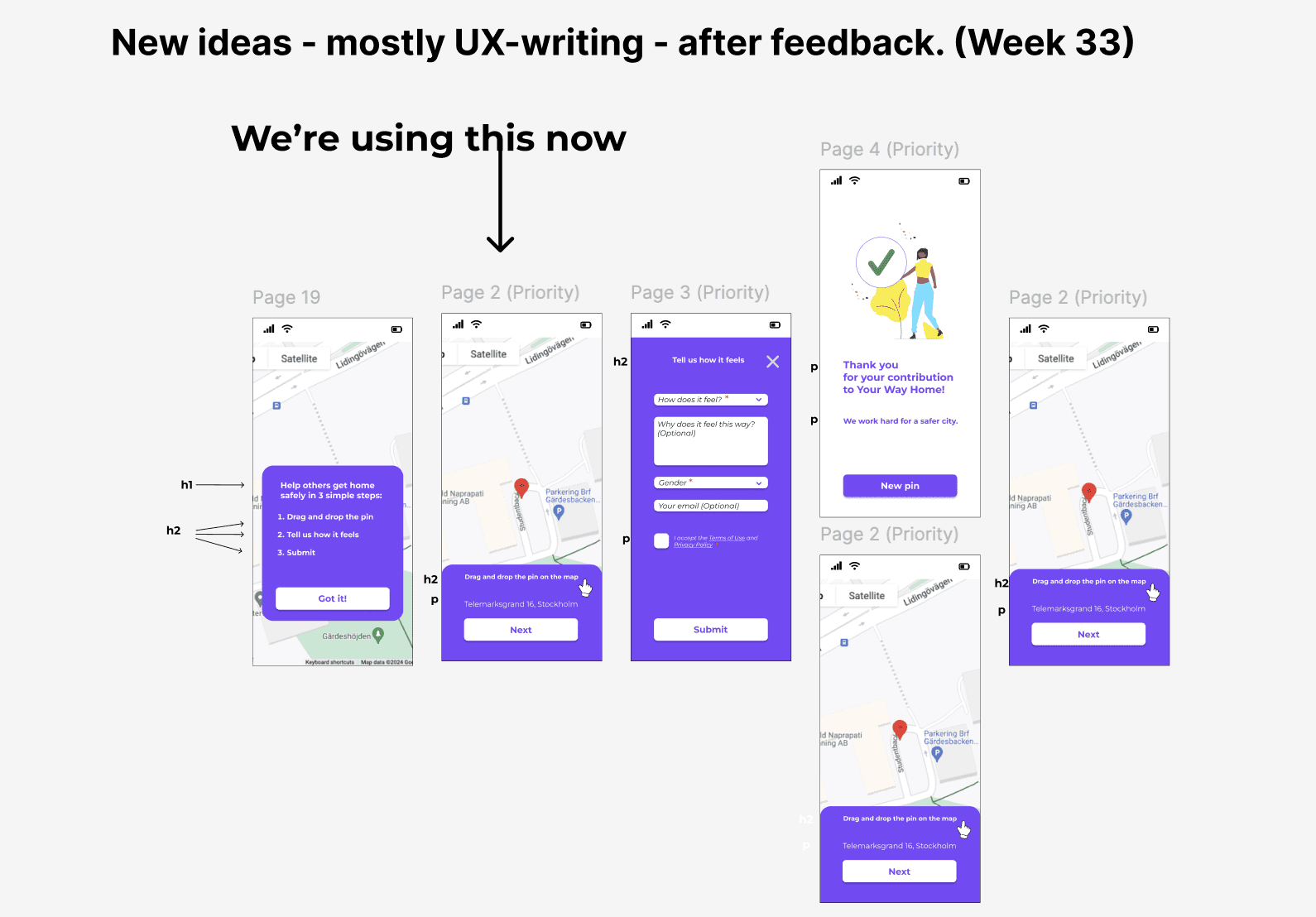 Wireframes & mockups: People's insights about the interface and the recurring themes helped me with new design ideas for the "Drop-a-pin". In parallel with the interviews and testing, I worked continuously with new design ideas. Many iterations took place until the launch of the final result.