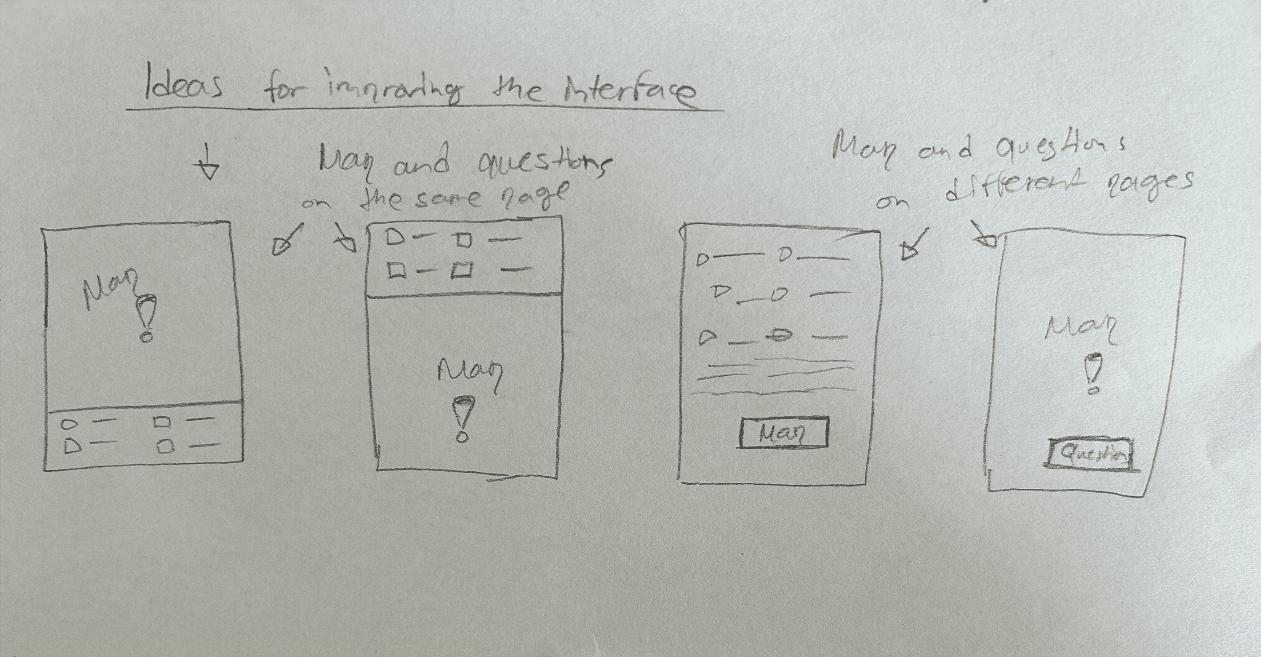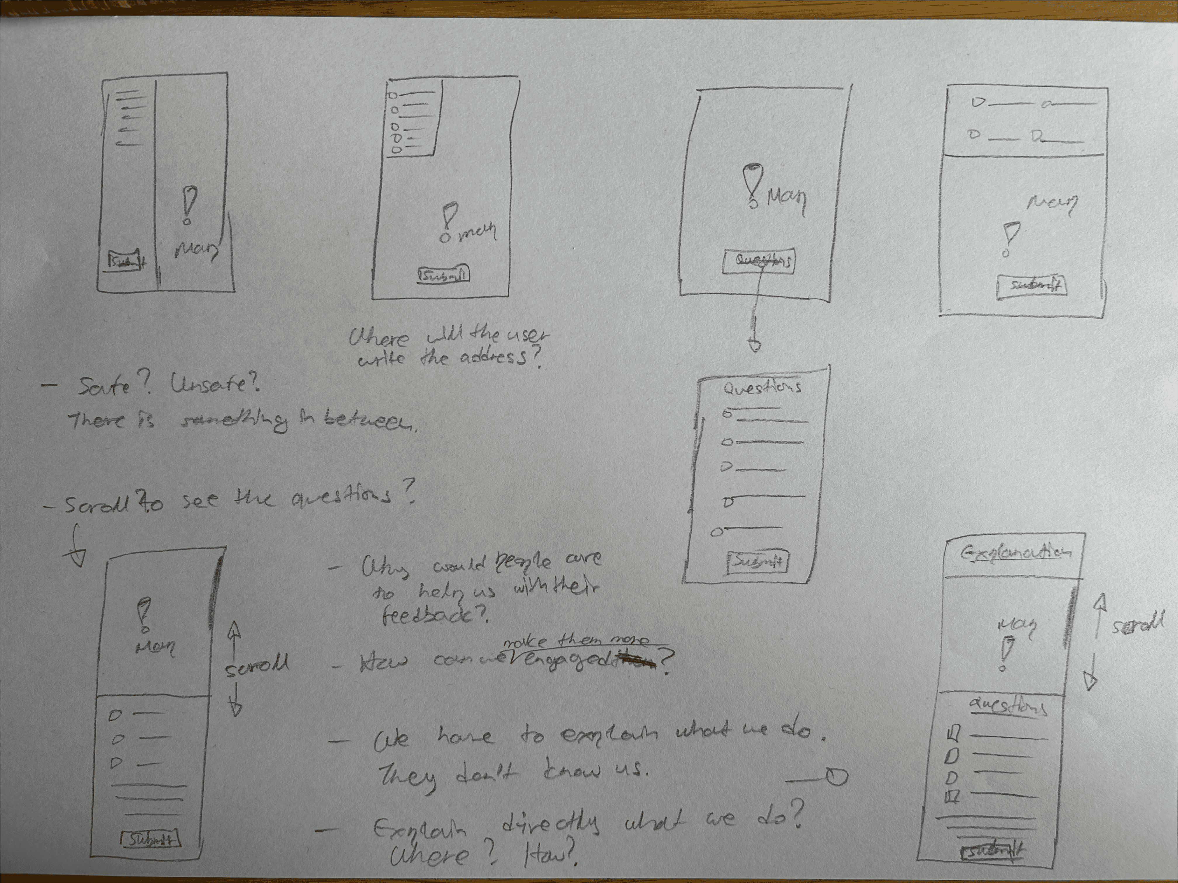 The wireframes on paper below show ideas that led to more detailed mockups.